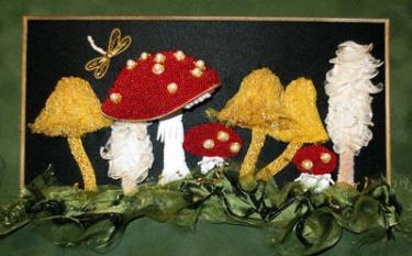 These toadstools are inspired by the many varieties that Alison saw in a forest on the way to Paris in 2010. This project is a mixed media / Goldwork piece that uses a variety of Goldwork threads – both English and sadi – alongside a variety of fabrics for manipulation. Traditional Goldwork methods are employed such as brick stitch, applying kid and laying purl along with distressing and melting fabrics – something for everyone! The design is 19 cm x 10 cm (and almost 2.5 cm in relief)