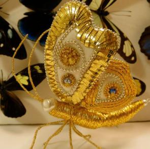 Traditional Goldwork is the execution of fine embroidery with gold threads using established techniques and designs on cloths such as velvet, damask, silk and linen. Creative Goldwork is the vision of extending the traditional discipline to the next level, by using the established forms freely and creatively without limit. On the first day of class you will explore and learn some of the traditional stitching techniques on flat cloth. On day two of the class we will become more adventurous and will stitch gold threads in three dimensional designs. The butterfly measures 12cm x 10cm. At the end of the day you will take home goldwork samplers with English, Peruvian and Australian blends! Tutor Bella Lane is a master in goldwork, and a winner of the top prize for Traditional & Creative Goldwork at the Royal School of Needlework in Hampton Court Palace, London in both 2008 and 2009.