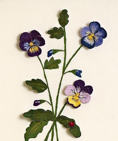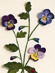 Bets MaasThese delicate violas appear to be so lifelike. They are stitched using the Barbola technique which is related to stumpwork yet does not use wires.